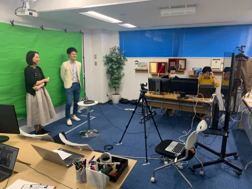 実際は社内の社長室でグリーンスクリーンを広げて撮影しており、ダイナミックさとは裏腹に少々地味な撮影現場となっていました。