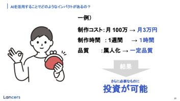 次に、制作時間です。これまで”1週間かかっていた作業が、AIによって1時間ほどで完了する”ケースもあります。大げさに思えるかもしれませんが、実際の現場ではそれほどの効率化が実現しているのです。