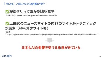 海外ではすでに検索クリック率が大幅に下がっており、上位50のニュースサイトのうち37サイトがトラフィックを減らしています。AIによる要約(AIオーバービュー)の台頭により、”ユーザーは検索結果をクリックせずに情報を得るようになってきています”。この流れは日本にも確実に訪れつつあり、検索依存のリスクは今後さらに高まります。