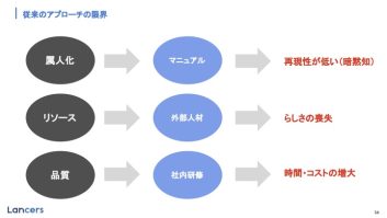 次に”「リソース不足」”です。人材が限られるなかで、コンテンツ制作まで手が回らないという声は多く聞かれます。外部人材を活用する方法もありますが、”委託が続くと“らしさ”を失いやすい”という課題があります。