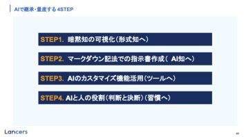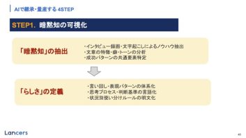 まずは素材として「良いアウトプット」を選び、AIに学習させることが重要です。記事やインタビューの中から”適切な事例を目利きし、分析にかけることが暗黙知の可視化の第一歩”となります。