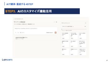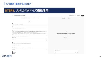 これらの事例ではカスタムAIの構築が大きな役割を果たしています。通常、AIを使う際にはプロンプトを毎回工夫して入力する必要がありますが、これは現場では大きな負担になりがちです。そこで、あらかじめプロンプトを組み込んだカスタムAIを用意しておけば、あとは実行指示を出すだけでアウトプットが生成されます。