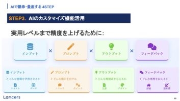 この4つを調整することで、AIの品質は大きく向上します。「プロンプト1本勝負」から、「インプット・プロンプト・アウトプット・フィードバックを動かす総合的な調整」へと進化しているのです。