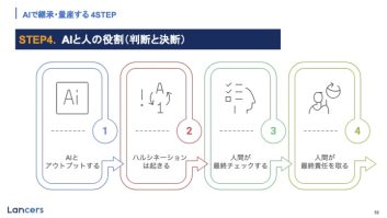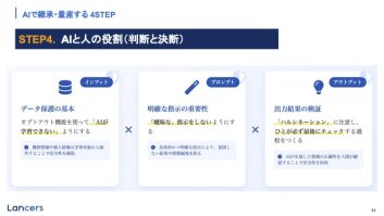 AIは1次情報からA案・B案・C案といった複数のアウトプットを生み出すことが得意です。しかし、”「どの案を採用するか」という決定はAIにはできません”。最終的な判断と決断は人間が担う必要があります。