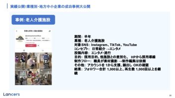 ある老人福祉施設では、採用強化を目的にInstagram・TikTok・YouTubeのアカウントを新規で立ち上げました。採用告知だけを行うのではなく、日常をエンタメ要素を交えて発信することで、他施設との差別化を図りました。