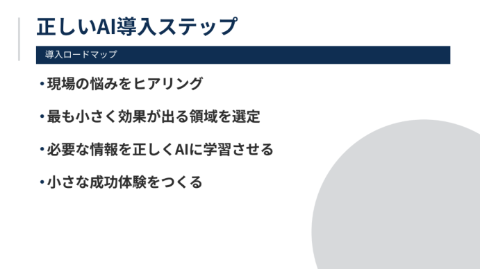 社内のAI導入で失敗する要因の1つは「いきなり全体を変えようとする」ことにあると言います。