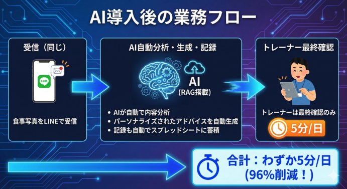 これによりトレーナーは、AIが作った回答を「最終確認」して送るだけになり、食事指導の業務が圧倒的に効率化されました。