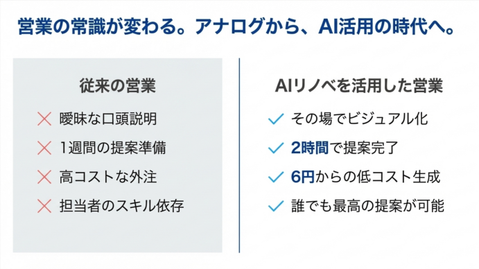 リフォーム・リノベーションの商談において、最も成約を遠ざける要因は、お客様との完成イメージのズレにありました。