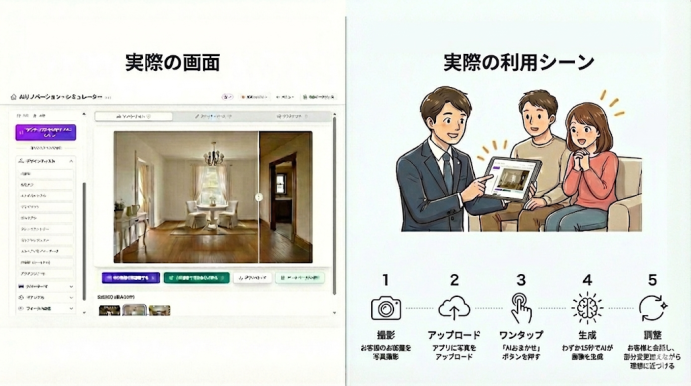 これまではスケッチや参考写真でのすり合わせが当たり前だった商談が、お客様の実際のお部屋を基にビジュアルの生成と微調整ができるため、その場でイメージを共有する体験へと進化しました。