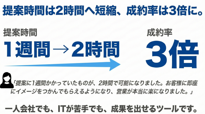 - 提案時間を1週間→2時間に短縮し、結果として成約率3倍につながったポイント