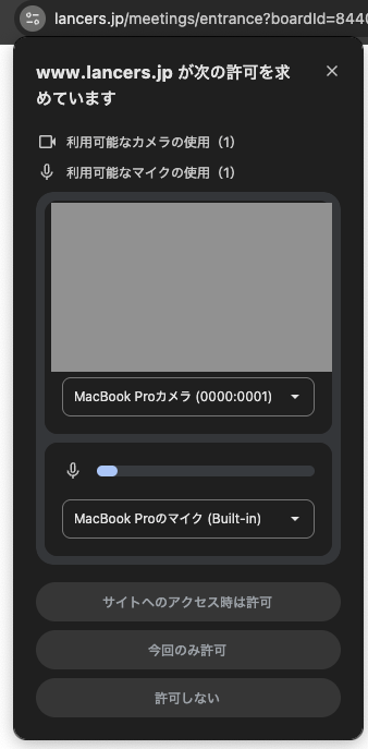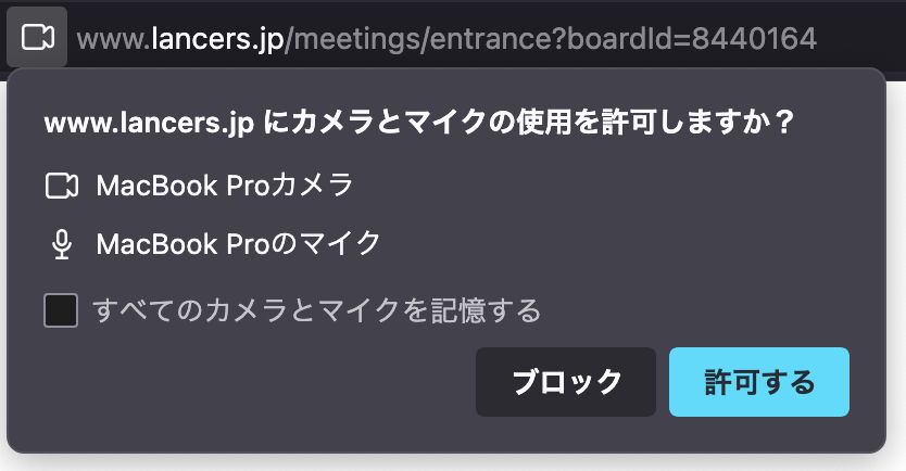 カメラとマイクへのアクセス要求が表示された 初回使用時や、お客様の端末やブラウザの設定変更後はカメラとマイクへのアクセスを許可するためのポップアップが表示されることがあります。 Google Chrome 「サイトへのアクセス時は許可」または「今回のみ許可」をクリックしてください。 Firefox 使用するカメラとマイクを選択し、「許可する」をクリックする。 「すべてのカメラとマイクを記憶する」にチェックを入れて「許可する」をクリックすると、それ以降ポップアップは表示されなくなります。 解決しましたか? 解決できないときは、 ユーザー同士で助け合うクラウドソーシング相談室 または ランサーズのサポートチーム までお問い合わせください。