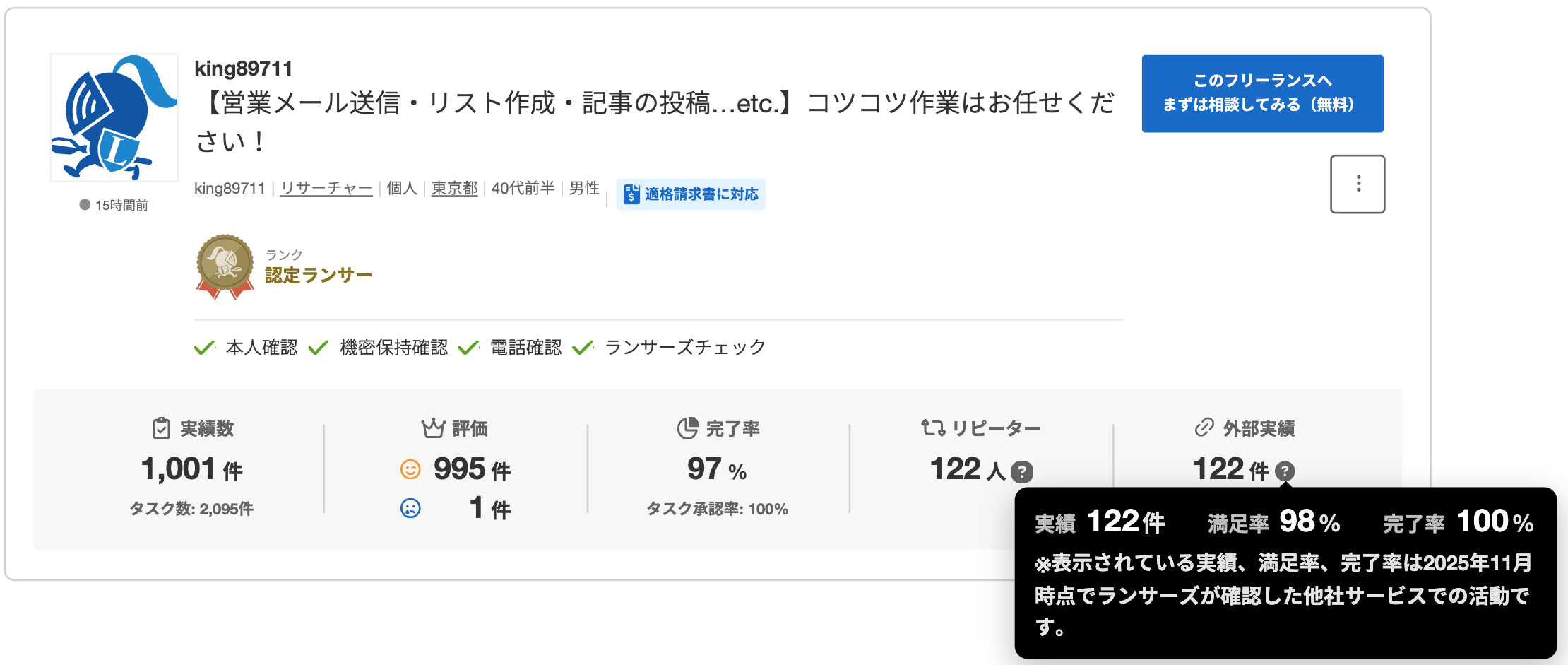 ランサーズ外のプラットフォームでのタスク系以外の仕事で、受注数、完了率、満足度・評価の情報とそれを証明できるリンク、画像が必要です。