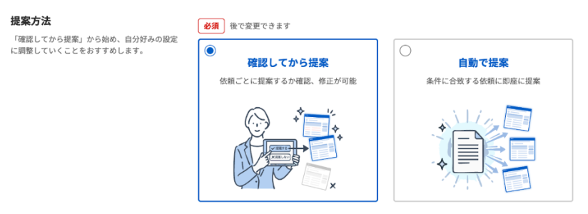 自動提案 の新規作成・編集画面で、提案方法を2つから選べます。