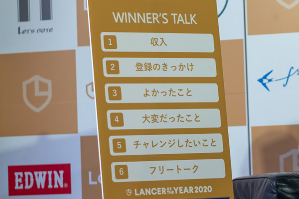 ワタナベ:はい。(受賞者に語っていただくテーマは)1番は、収入について。2番が、ランサーズ登録のきっかけ。3番が、よかったこと。4番が、大変だったこと。5番が、チャレンジについて。6番が、フリートークとなっております。