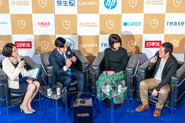 そこで取り入れたのが、某テレビ番組をオマージュしたトークショーです。司会進行に『ランサーズ代表取締役の秋好陽介』と『カスタマーサポート兼LOY司会のワタナベさん』が聞き手となり、2人ずつ3組の受賞者とのぶっちゃけトークを楽しみました。
